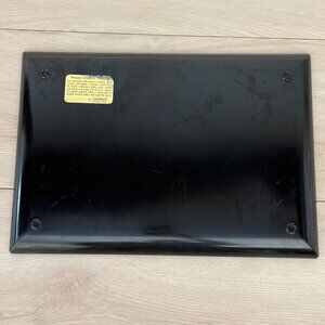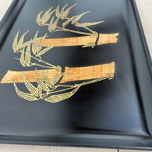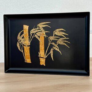 Rectangular in shape (approx 15.5 x 10.5”) made of phenolic resin, wood, and brass featuring a bamboo pattern. The black base is glossy and has a mid-century modernism style. It’s an original piece from the 1960s manufactured in the USA.