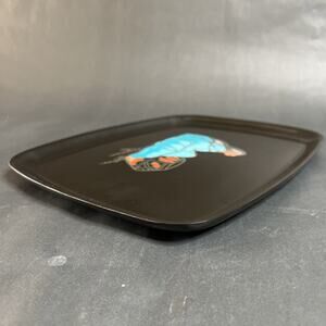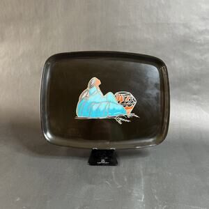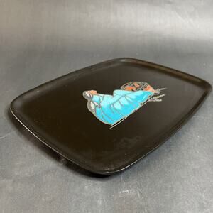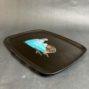 This vintage Couroc tray features a striking inlaid design of a Native American woman holding a pottery vase, set against Couroc’s signature black resin background. Made in Monterey, California, this mid-century piece blends folk art storytelling with sleek, functional design.