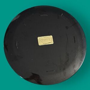 Large, lovely round black tray with birds on a branch motif. Inlaid wood, brass and crushed stone accents. Couroc of Monterey, California. Partial foil label and molded signature on the back. Some minor scuffs from use. It measures 14" by 14" by 1/2".