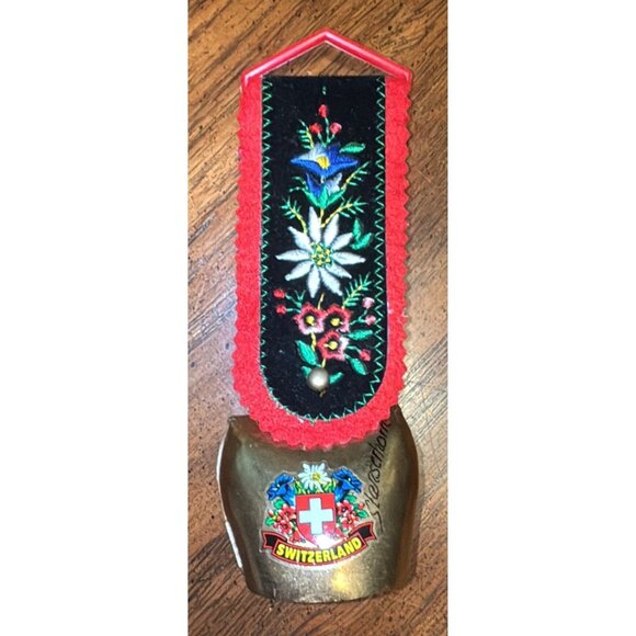 Vintage Cow Bell Embroidered Strap Switzerland Decorative Brass Swiss