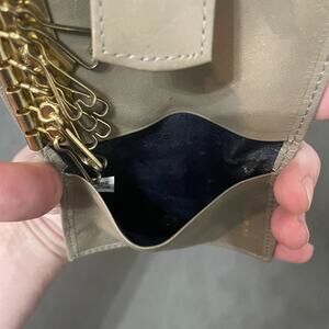 DESCRIPTION: Gently used leather key holder wallet in beige taupe colorway with an embossed geometric design.