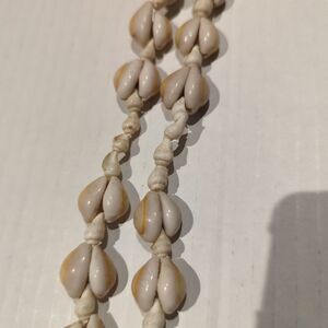This Vintage Cowrie Puka Shells Necklace is a handcrafted piece that embodies a tropical Hawaii beach boho hippie style. The necklace features natural cream cowrie shells strung on a beige string with a length of 17 inches. The unique combination of materials and colors gives it a timeless and original look, perfect for those who appreciate vintage and bohemian jewelry.