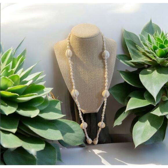 This is a 35-inch white Cowrie Shell and Nassa Shell Necklace from the 1970s. It is, of course, preowned and in good condition.