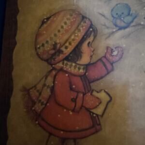 This charming vintage wood plaque features a sweet illustration of a little girl bundled up for winter, gently offering snow to a tiny bird perched on a branch. The artwork is signed Ginny and reflects the soft, nostalgic style seen in Holly Hobbie–era illustrations. Warm tones, rustic wood texture, and a soft-aged patina make this wall hanging feel like a vintage treasure from a cozy childhood memory.