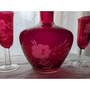 This elegant cranberry decanter set features intricate floral etching and includes a matching stopper and three cordial glasses, adding charm to gatherings.
