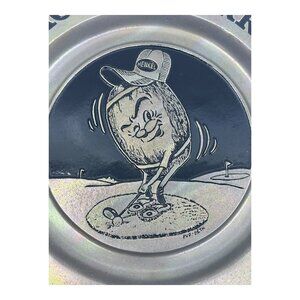 Vintage Cracker Barrel Memorabilia Henkel Golfing Round Pewter Plate 12"This vintage Cracker Barrel memorabilia Henkel golfing round pewter plate is a unique and collectible item advertising the popular restaurant chain. The silver plate features a design related to the restaurant's theme, making it a great addition for collectors of restaurant memorabilia. With its original and authentic nature, this 12" plate is a charming piece of history that would make a great display in any restaurant or fast food enthusiast's collection.