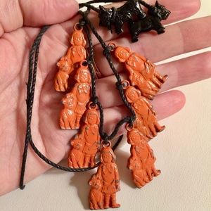 Seven painted Buster Brown & Tige charms and two Scotty dogs have been fashioned into a fun tie-on necklace. All collectable premium Cracker Jack prizes from the 1930’s. Painted metal charms tied onto black waxed string.
