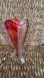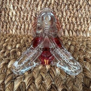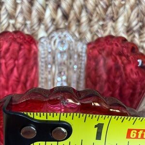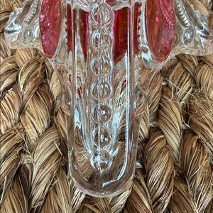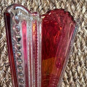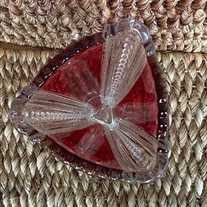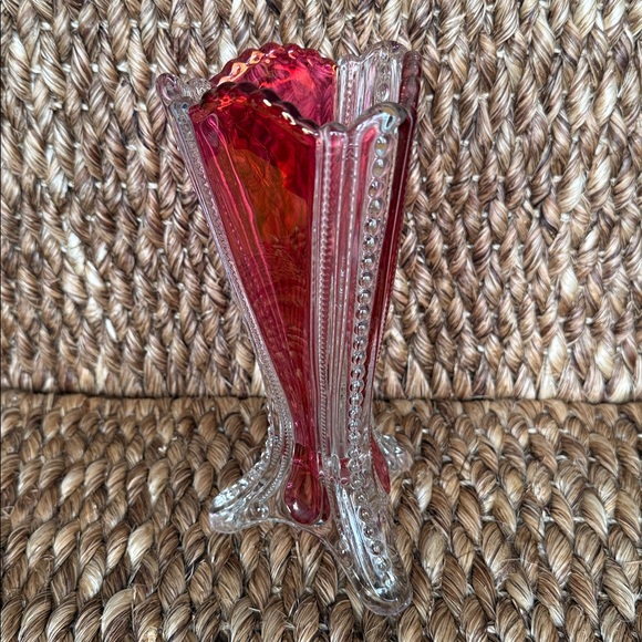 Triangular base w/ 3 scrolled feet. Clear outer glass with cranberry flashed interior.