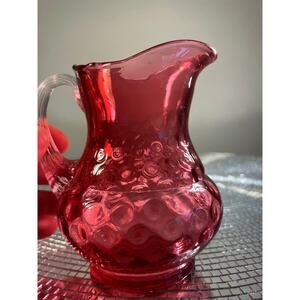 Vintage Cranberry Glass Coin Dot Thumbprint Pitcher W/ Clear Ribbed Bud Vase