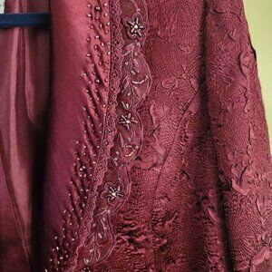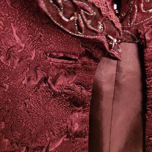 Vintage Cranberry Textured Embellished Carissimo Blazer Size 10. Pit to pit 22", shoulder to hem 29", Absolutely Stunning, Lace Beaded Shawl Collar, Lace Beaded Cuffs, Fully Lined, Holiday, Unique, Missing Button. Good Pre-Owned Condition