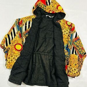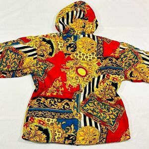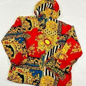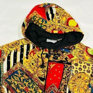 Vintage Crazy Pattern Hooded Drawstring Waist Zip Up Jacket. Way To Go Worldwide Clothing. Drawstring Hood and Waistline. Two Front Pockets. Super Cool Pattern! Versace Vibes. Good Condition 7/10. Some snags, light stains. Zipper is fully functional but does get caught and takes a little finesse. Size Medium
