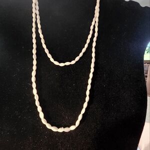 This vintage double-strand necklace features smooth, oval-shaped cream beads with a soft sheen that gives a timeless and elegant look. The lightweight beads drape beautifully, offering versatility to wear long, doubled, or layered with other pieces. Its understated neutral tone makes it the perfect accessory for both casual and dressy occasions. A classic design that captures the charm of mid-century fashion, this piece is a must-have for vintage jewelry lovers.