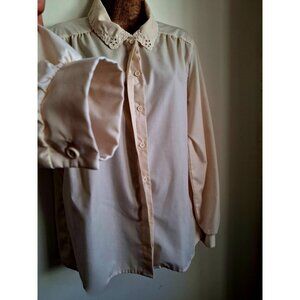 This elegant vintage cream blouse features a delicate embroidered lace collar and button-up front. Its long sleeves add a timeless, refined touch.