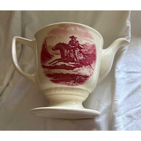 Vintage Cream Ceramic Teapot With Cowboy Horse Scene & Red Floral Handle Design
