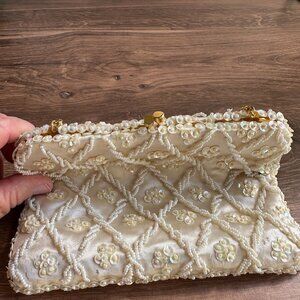 This elegant vintage evening bag is perfect for weddings, prom, or formal events. It features intricate hand-sewn bead and sequin details on luxurious cream fabric, complemented by a gold-tone chain.