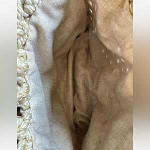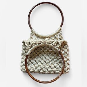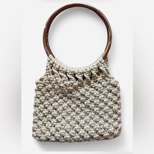 This vintage cream crotchet bag features wooden handles, and a beige interior.