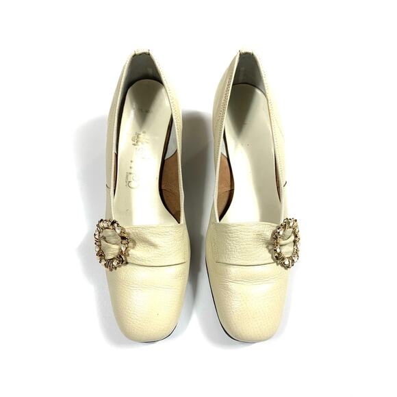 Vintage California cobblers ivory cream low block heels with gold and ivory embellishment, one blemish on inside heel near seam but is not too noticeable shown in pictures, gently worn overall good condition.