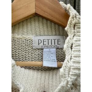 Romantic knit with cablework, floral embroidery, and pearl accents. Scalloped hem + ruffle mockneck give it a soft, cottagecore feel with a touch of grandmacore irony. Tagged Petite Small — fits XS a little slouchier, S more true to size.