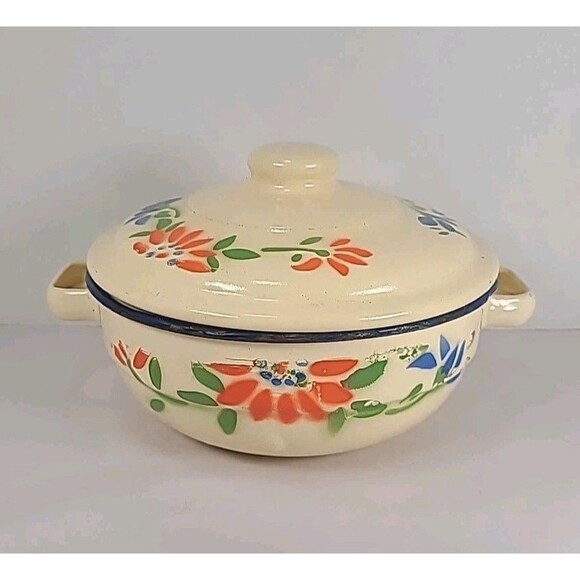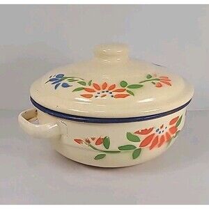 Vintage Cream Floral 2 Quart Enameled Pot With Lid