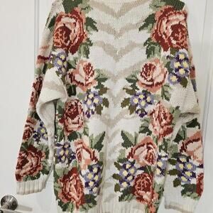 Vintage Cream Floral Chunky Hand Knit All Over Pattern Sweater Cottage Core M