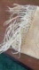 Elegant cream knit scarf with a diamond pattern and fringe edges.
