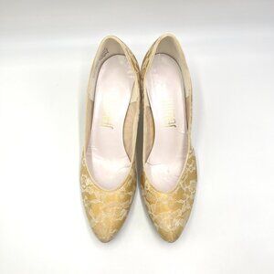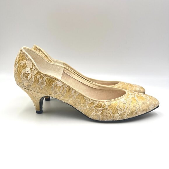 Vintage Jeanine kitten heels with a cream lace over gold fabric upper.