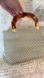This stylish cream metal mesh handbag features chic tortoise shell handles, perfect for adding a touch of elegance to any outfit. Ideal for both casual and formal occasions.