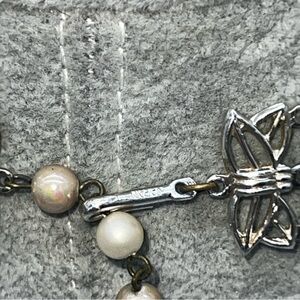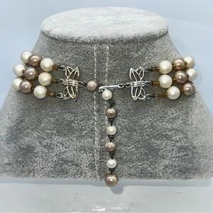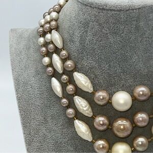 This exquisite multi-strand necklace showcases a beautiful arrangement of creamy pearls with a lustrous sheen. The design features three distinct strands, with the bottom strand being the most elaborate, adorned with clusters of larger pearls. Perfect for making a statement at any special occasion.