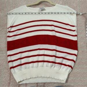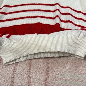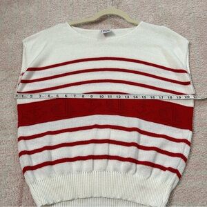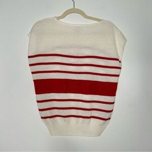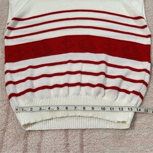 Stylish sleeveless sweater with bold red and creamy off white stripes. Large red stripe features sailboats and anchors.