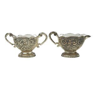 Vintage Cream Sugar Set Roses Floral Scalloped Edges Tray Enamel Interior Japan