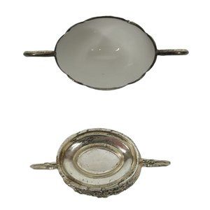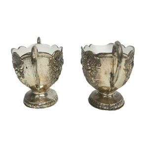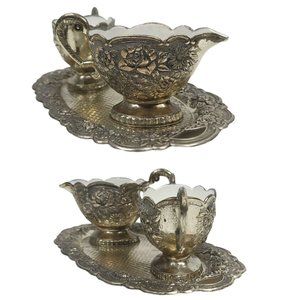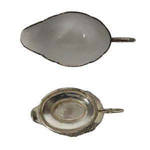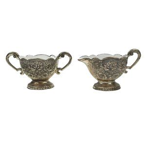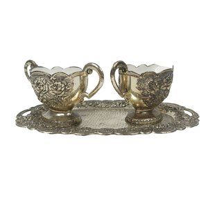 Vintage pre-owned condition. Overall tarnishing (photos 1 - 11). White enamel interior on the creamer and sugar containers, some interior wear to both (photos 6 - 7). Approximate size: Tray - 8" L x 4.5" W; Creamer - 4.25" L x 2.25" T x 2" W; Sugar - 4.5" L x 2.25" T x 2" W. Please see all photos for further description and condition.