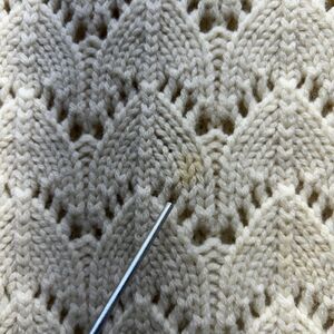 Garment type: womens pullover sweater with lace-style openwork knit front and textured knit sleeves and back.