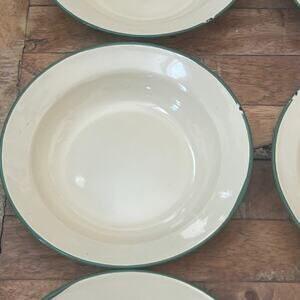 Vintage Cream with Green Trim Enamelware Bowls 7" Set of 8 Country Farmhouse