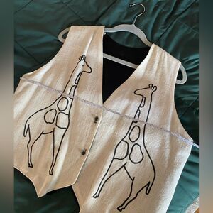 Vintage Cream and Black Linen Hand-Embroidered Giraffe Design Vest Size Large