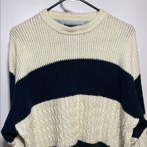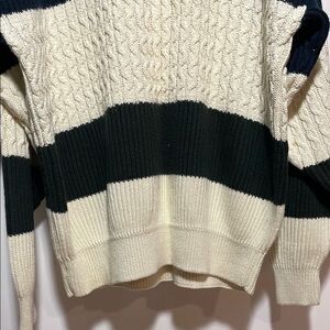 This sweater showcases a timeless horizontal striped pattern in cream and black, featuring a crew neckline and a relaxed fit. Crafted from a medium to heavy weight knit, it's perfect for cooler weather, offering both style and comfort.
