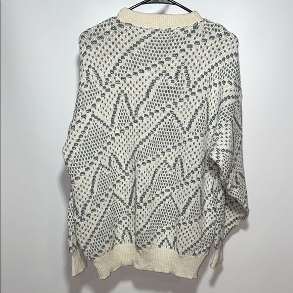 Vintage Cream and Gray Crew Neck Sweater with Geometric Pattern