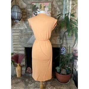 Sweet and simple vintage midi in the dreamiest pastel orange shade (aka creamsicle vibes). Soft knit fabric with comfy stretch, v-neckline, single chest pocket, string belt loops, and elastic waist for an easy fit. Features capped sleeves and a 9" side slit for that laid-back summer feel. In gently used condition.