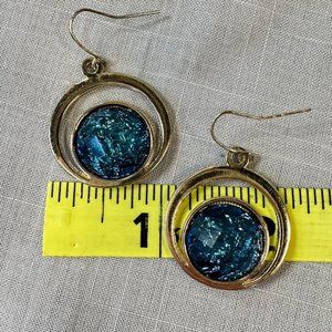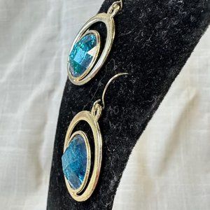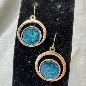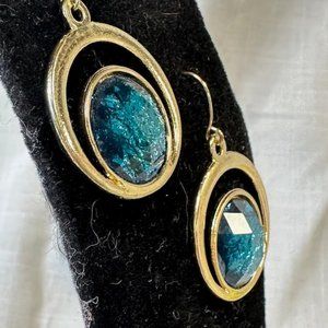 A dreamy pair of earrings in a gold tone metal setting. A large round faceted and foiled blue center has a dichroic look. Two circles set together at the bottom edge, creating a crescent moon around the top. In excellent condition, and each one measures just over 1" in diameter. Unmarked.