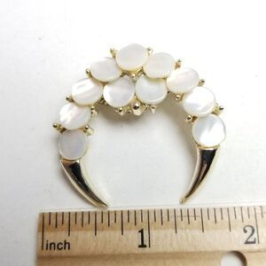Vintage Crescent Moon Shape Brooch, Gold Tone White Disc Detail Lapel Pin