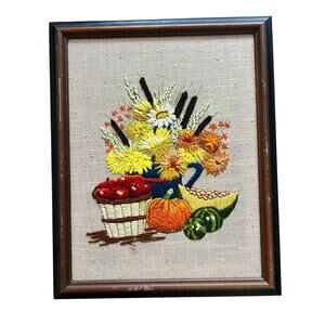 Vintage Crewel Embroidery Framed Fruit Flowers Fall Autumn Apple Pumpkin 20"x16"