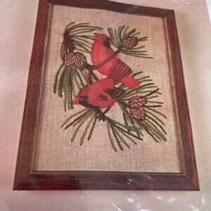 Vintage Crewel Embroidery Kit Red Cardinals Picture NOS Pinecone 1960s Hiawatha