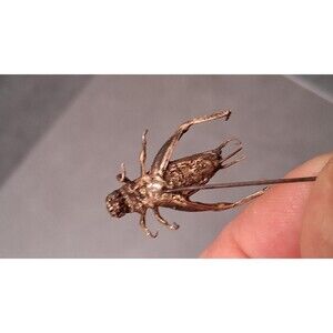 Delightfully creepy stickpin is a silver tone cricket or grasshopper. It could be sterling silver -- its not marked at all. It looks like it might be a real insect under the metal coating because its so detailed and authentic looking!