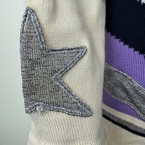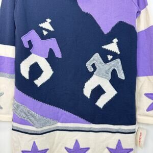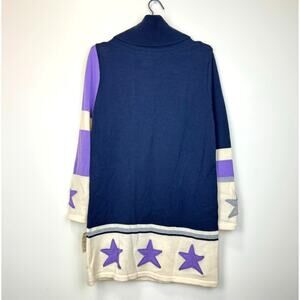 - Features: wool blend, star and people appliques, loose turtleneck, tunic or short dress length