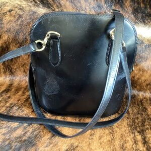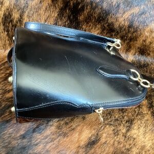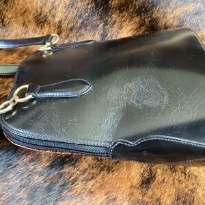 This is a really pretty and unique leather handbag with a full tooled front. Gold tone link hardware. Full zipper top closure. Nice longer shoulder carry straps. No maker marker found. Only tag says Genuine Leather Made in Italy. The zipper pull says Cristian (photo enclosed). There is a mark on back of bag. (Not sure what it is). Still has value and beauty.