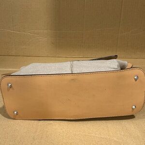 The vintage Cristian Italy Shoulder Bag features a linen and leather construction with snake skin accents. This medium-sized rectangular bag with a snap closure and shoulder strap handle in beige offers a versatile style suitable for travel, casual, and business occasions. Made in Italy.