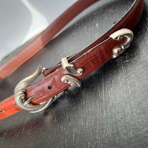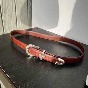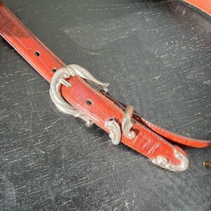 Crafted with genuine leather, the belt has a rich patina and character-enhancing creasing from gentle use. An ideal statement piece for jeans, prairie skirts, or dresses โ whether you're going full-on cowgirl or just adding a touch of Western flair. Likely a Brighton belt, although not marked as such.