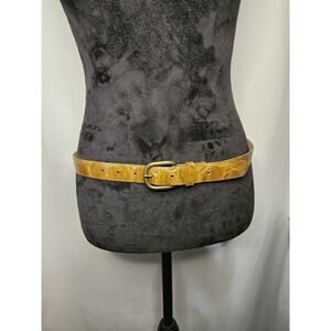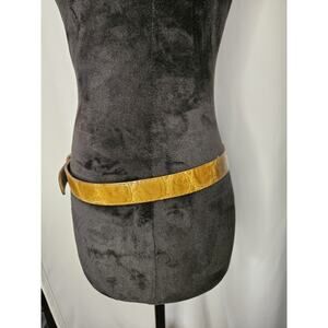 This vintage croc print faux leather belt in brown with a medium width is a stylish accessory for women. Made in the USA with brass hardware, this belt features an animal print pattern and a buckle accent. With a size large (38" length, 1" width) and adjustable fit, this belt is perfect for adding a touch of retro flair to any outfit, whether you're into 80s or 90s style. The unique design and quality construction make this belt a standout piece for any wardrobe.