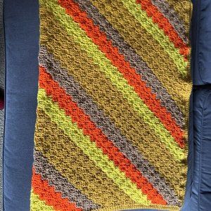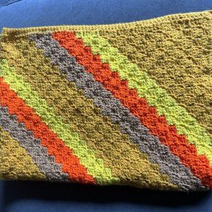 Retro 70s/80s Vibe Handmade Crochet Afghan Lap Throw Blanket Shell Brown Yellow 34 x 45 inches. This pre-owned blanket has a diagonal design in retro yellow/gold/orange, and brown colors. Edging is mostly in gold, but has a small section finished in light brown. Blanket is soft, clean, and machine washable. No rips, stains, or tears. Feel free to message me with any questions. Thanks for looking!