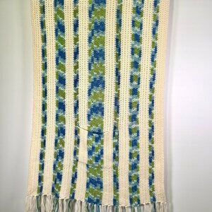 Vintage Crochet Afghan Blanket Striped Blue Green Cream Fringe Pockets Retro MCM