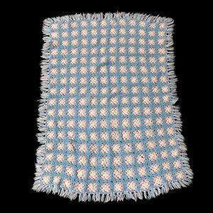 Vintage Crochet Afghan Blanket Throw Pink Blue Fringe Granny Square Handmade